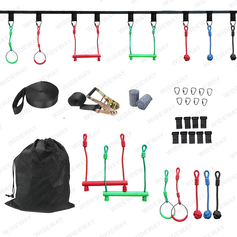 15m Slackline Prekážka s Ratchet vytvára dynamickú výzvu, zatiaľ čo všestranné prekážkové prílohy umožňujú deťom vyliezť, hojdať sa a vyvážiť cestu k majstrovstvu Ninja.
